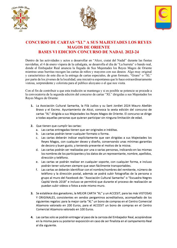 Como cada año nuestra Asociación convoca, junto con el Sant Jordiet, que recaerá este 2024 en la Fila Judíos, representado por el niño Mauro Abellán Bravo, el Excmo. Ayuntamiento de Alcoy y la Escuadra de Negres del Capitá Verds 2018 el concurso de Cartas XL de sus Majestades los Reyes Magos. Se establece dos ganadores, la MEJOR CARTA “XL” y un ACCESIT, para las más VISTOSAS Y ORIGINALES, consistentes en sendos pergaminos acreditativos, acompañado de los siguientes regalos: para la mejor carta “XL” un bono de compras en el Centro Comercial Alzamora valorado en 200 Euros, para el ACCESIT un bono de compras en el Centro Comercial Alzamora valorado en 100 Euros.